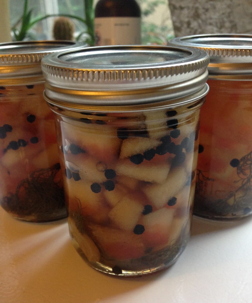 I’ve seen tons of food tv shows where someone pickles watermelon rind, and in the spirit of things like nose-to-tail and foraging philosophies, I decided to do it myself. I did a small batch flavoured with cinnamon, clove and black peppercorns. It was great, but too Christmas for me. Today I did a serious batch with jars and everything. They look great.