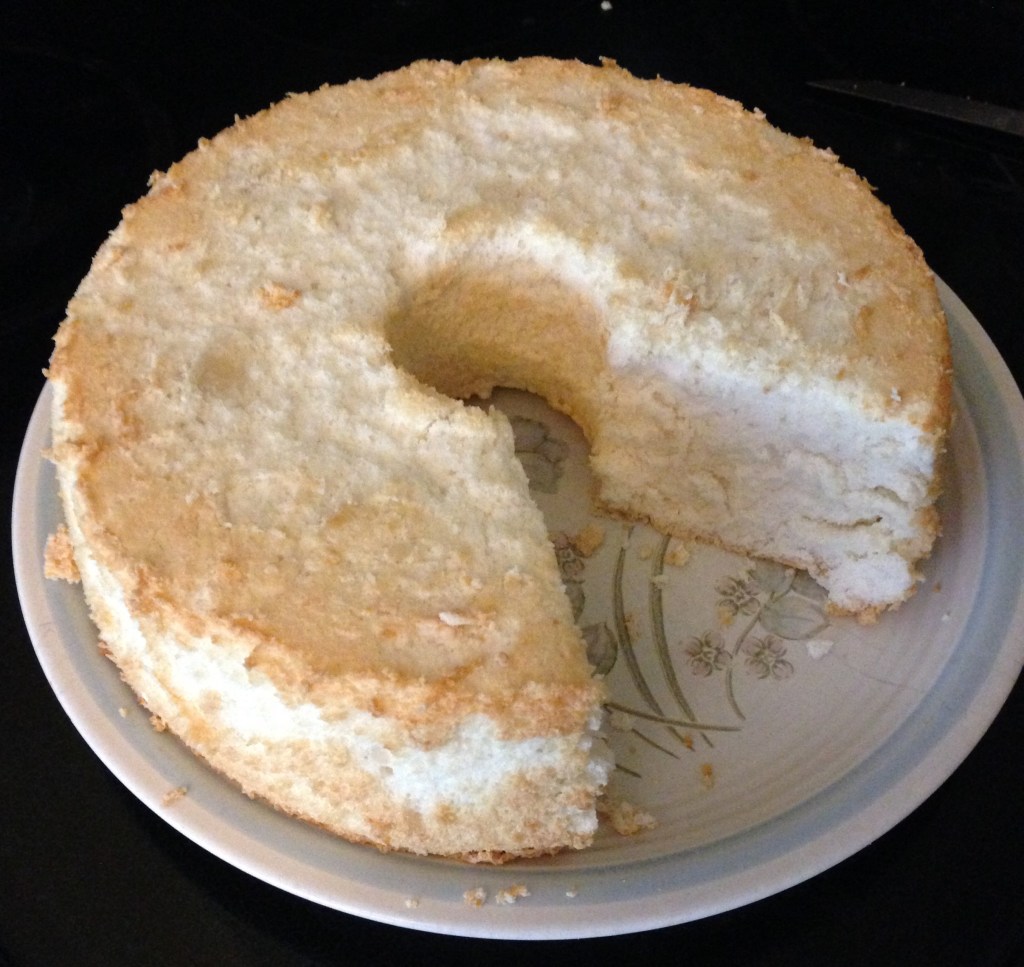Making ice cream has all sorts of bizarre side effects, mostly making friends and finding myself in interesting situations I’d never conceived of. A strange side effect that I’m particularly fond of is Angel Food Cakes. How are they a side effect of making ice creams? Well, my recipe essentially takes a 2L of milk, a 1L of cream and a dozen eggs, along with sugar and vanilla which I just buy in the largest quantity available to make it cheaper, and makes 4 batches. But when it comes to the eggs, I actually only use the yolks. The whites add nothing but unwanted water content to your ice cream, and should be removed for best results. So every 4 batches means I have a dozen egg whites saved up, and that’s eggsactly enough for an Angel Food Cake. The one above looks pretty good, though there are some small chunks of unmixed, par-baked flour that I need to solve next time. The cake is a finicky mix to make, because you have to combine heavy dry ingredients with light, airy beaten egg whites while keeping them light and airy. I did not use a sifter or sieve when I added my dry, and now I know better.