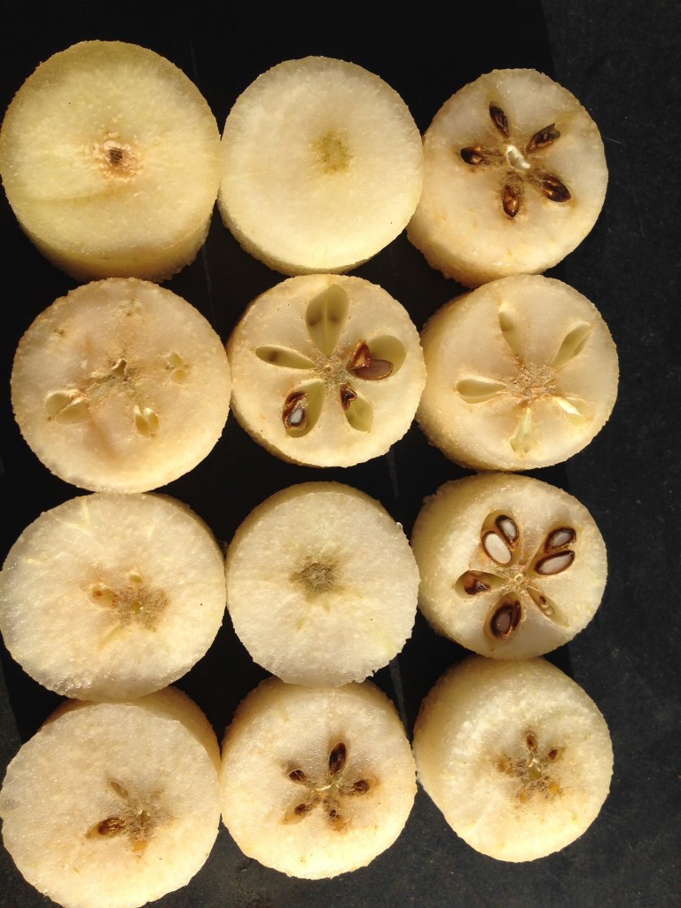 This is a picture of some of the pear cores. The more-ripe pears were cut up and cooked with brown sugar and yet more lemon juice. Once pureed, they became a delicious pear butter. You could also call them baby food, but that’s going to be a happy baby. I decided to take some of the pear butter and pear it with the dried pears, and added both to a vanilla ice cream base. I called it Pear Pair. I haven’t had it yet, but I’m excited to see how a dried fruit piece does in the ice cream. Raisins do okay, but aren’t very exciting. I’ve tried pears in the past and struggled with the water content, so this should solve that problem.