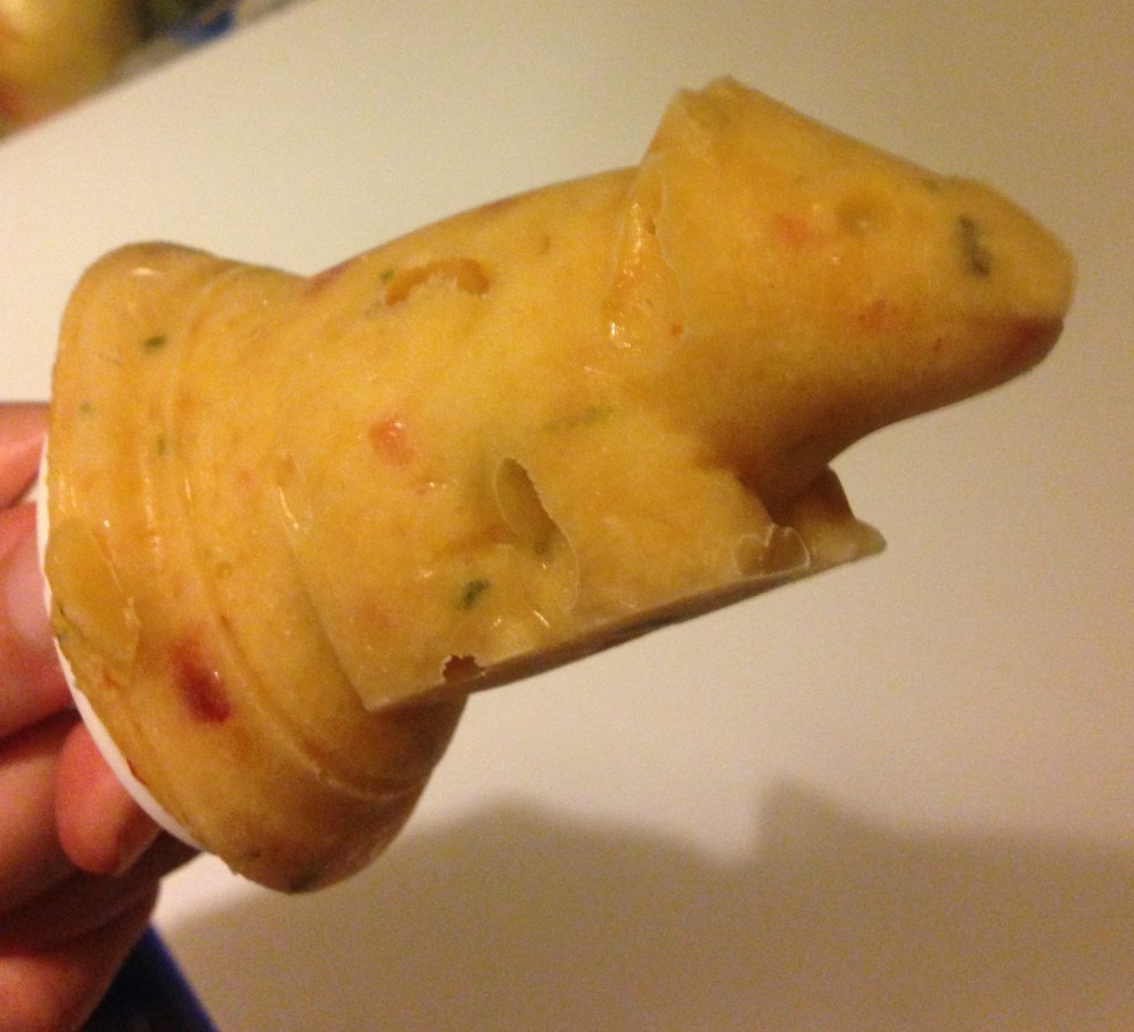 The sorbet is made of peaches that were macerated overnight in some sugar, lemon juice and some limoncello, with fresh basil leaves blended in. My roommates have been very enthusiastic about it, especially the bits of peach skin that survived the puree. They also give it some really nice flecks of dark red colour. I ate the dinosaur pop and it was amazing. For the record, 4 peaches were a perfect amount for a batch of sorbet.