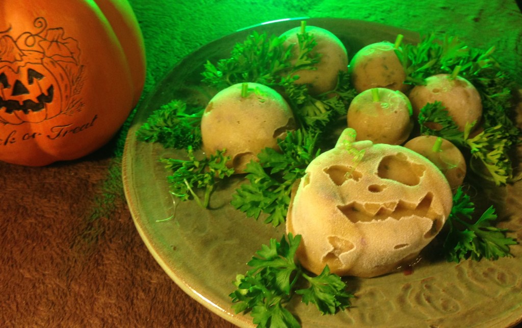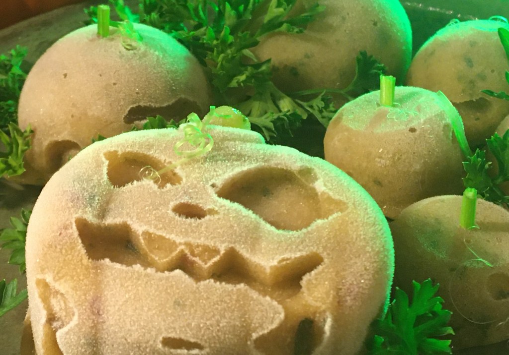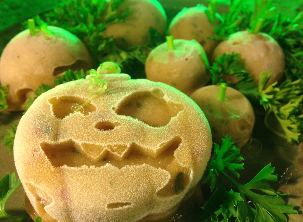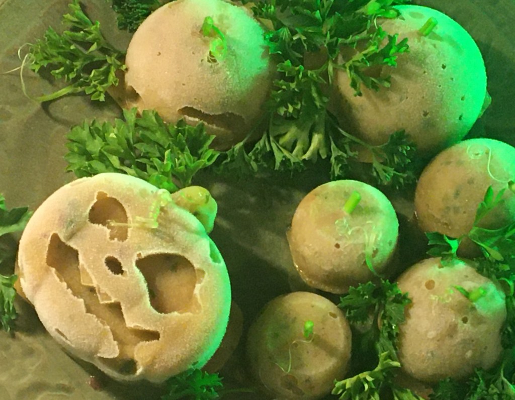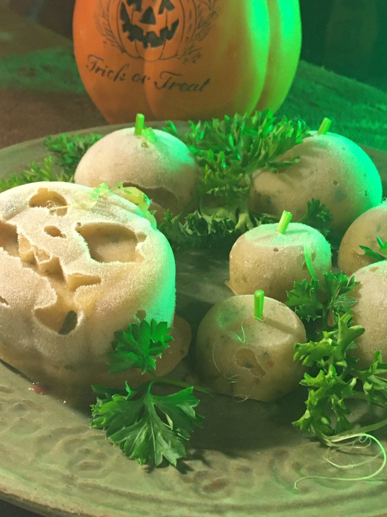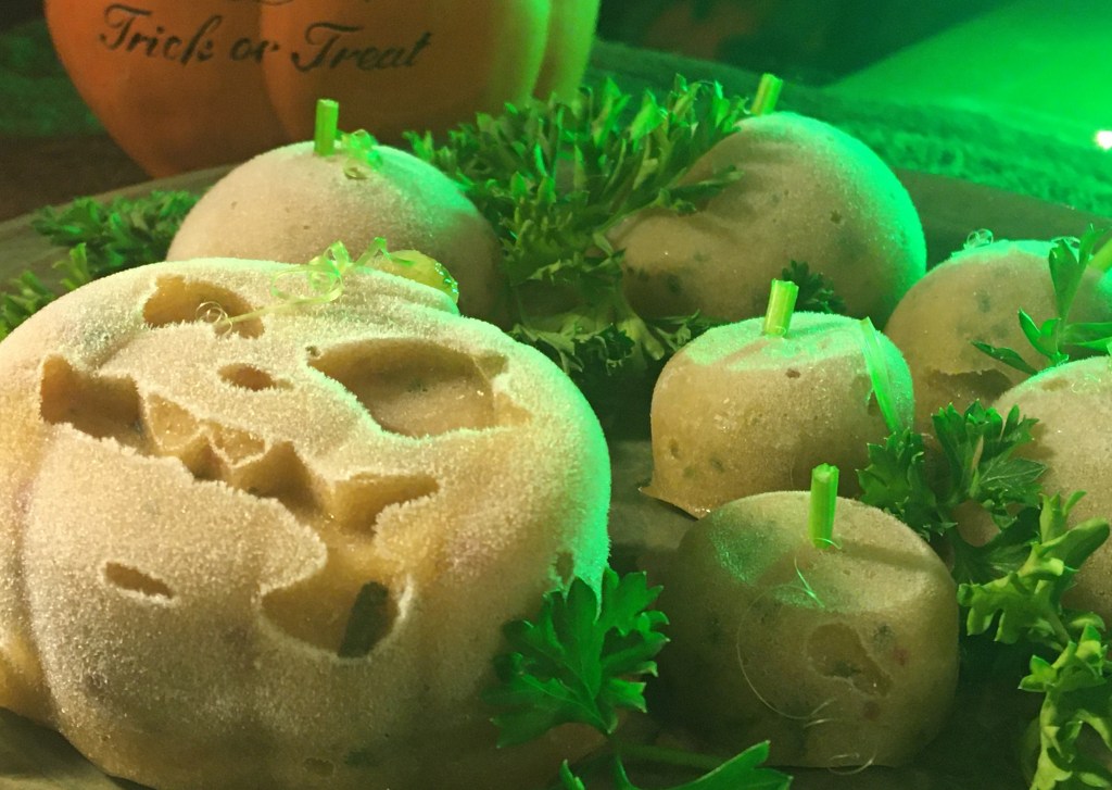 Hey there Ice Cream Club! I’m doing some spooky Ice Creams and some spookier photos all month! Here’s my first entry, a peach-basil sorbet pumpkin patch. I used molds for the pumpkins, and parsley for all the foliage. Have a spooky October!