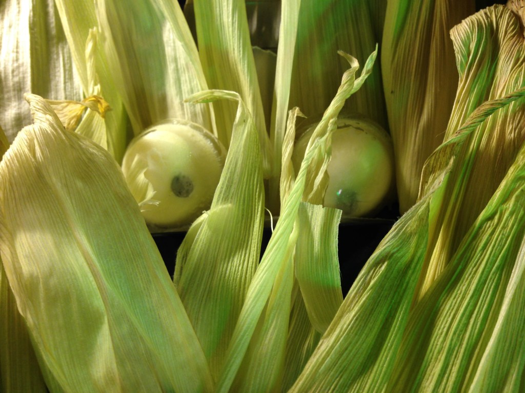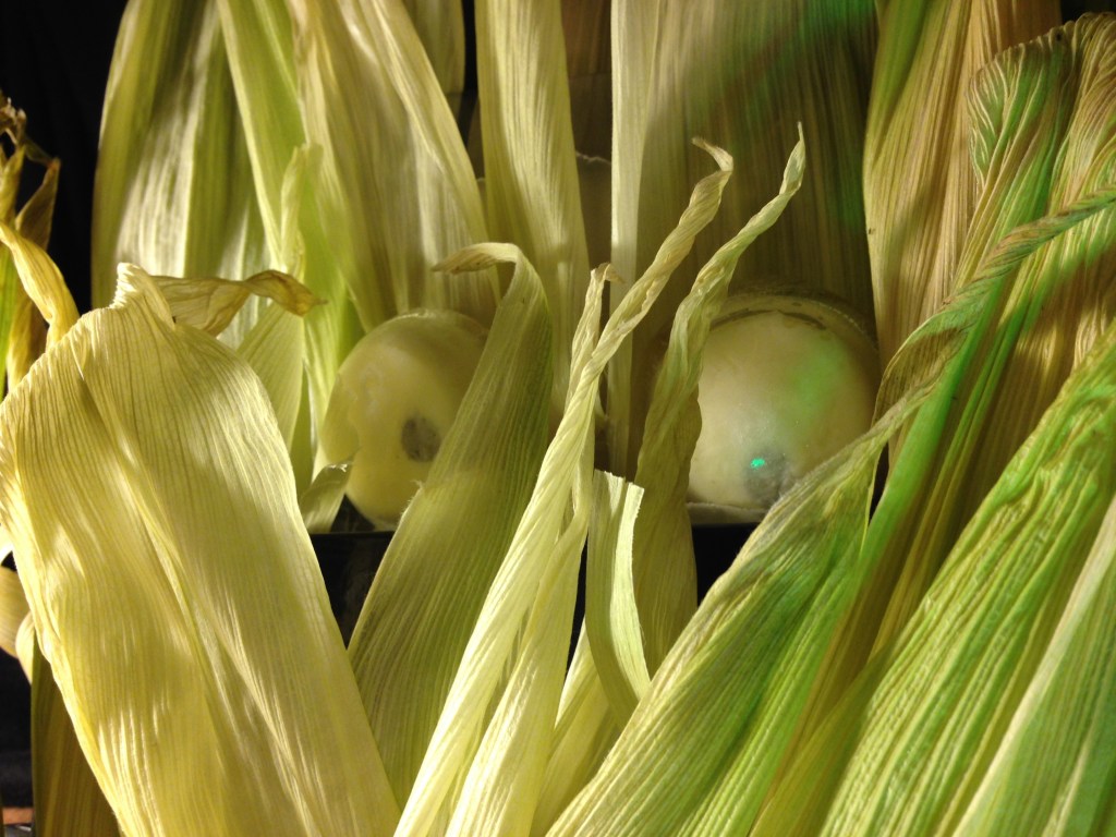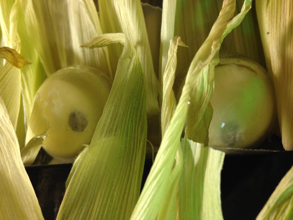 On Day 9, the results were a little spotty all around. I made a fresh corn ice cream mix, but something went wrong and there was a very sour element in it that I’m pretty sure is spoiled dairy. We’ve had some milk go off long before the expiry date recently. Not much, but some. I was still able to use a bit of the mix in the picture above. I’ve been watching a lot of Halloween food competitions, and a staple move of the sugar artists is to make isomalt eyes that look fairly real by layering different colours of sugar under a translucent dome. I tried that here with ice in the hemisphere molds. I put a little measuring spoon in the water before freezing it to give me a big empty cavity in the ice. I then put a chocolate chip in the cavity and filled it with a little of the corn mix. I’m actually pretty happy with the result, although 4 out of the 6 eyes I made were unusable because the cavity was too shallow. In the picture we were going for a ‘Children of the Corn’ thing, but the eyes look like mantis eyes, and the corn husks never really stood up in a convincing way.